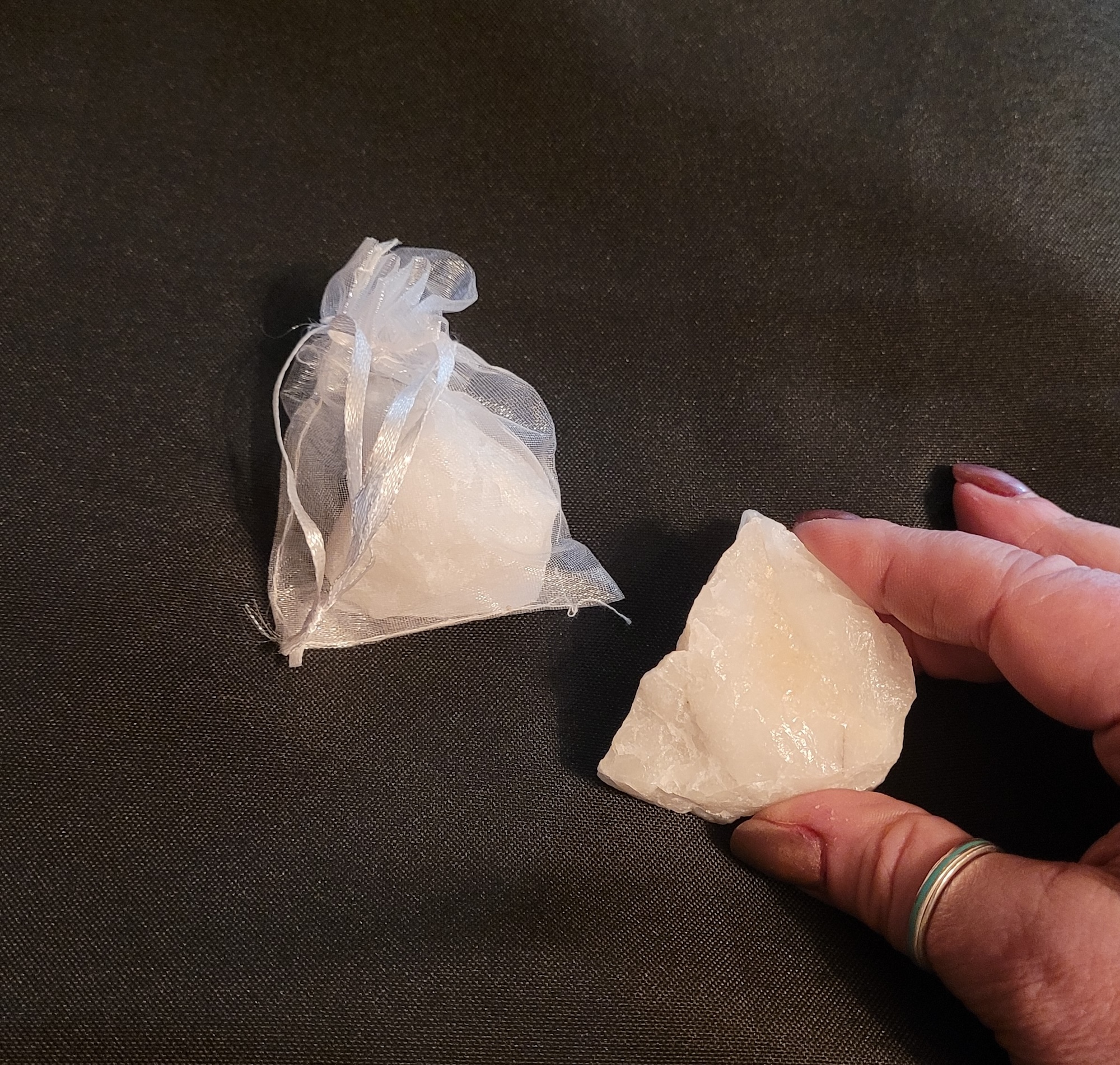 White Quartz in a white organza bagWhite Quartz in a white organza bag